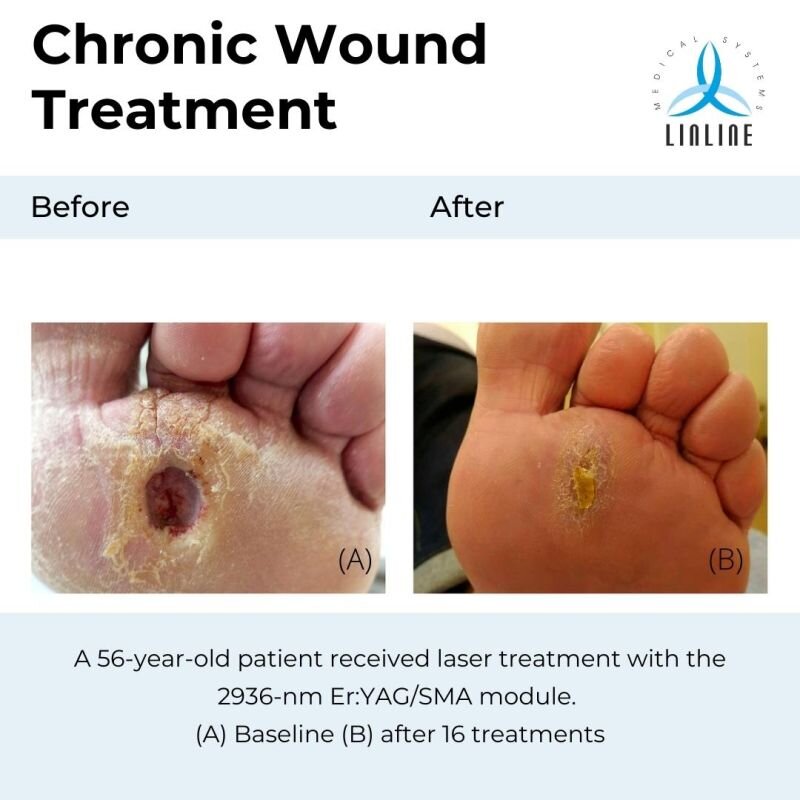 Pacientam K tika veikts lāzera procedūru kurss ar Multiline Laser Platform (Er:YAG/SMA modulis). Pirmās divas nedēļas ārstēšana tika veikta katru otro dienu, pēc tam divas reizes nedēļā. Pēc 16 procedūrām tika novērota pilnīga brūces epitelizācija, un palikusi tikai neliela hiperkeratoze plantārajā virsmā.